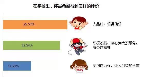 25.52%的孩子希望被评价为“人品好,值得信任”;22.54%的孩子希望获得“积极热情,热心为大家服务,有公益精神”的评价。相比之下,只有11.21%的孩子希望成为“学习能力强,让人仰望的学霸”。