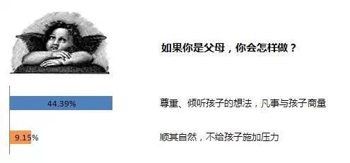 当问到“如果你是父母会怎样做”的时候,44.39%的孩子表示,如果自己是父母会“尊重孩子,倾听孩子的想法,凡事会与孩子商量”;只有9.15%的孩子选择做个“顺其自然,不给孩子施加压力”的父母。