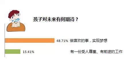 在调查中,48.71%的孩子表示希望将来可以“做自己喜欢的事情,实现自己的梦想”。相比之下,15.41%的孩子希望“有一份受人尊重而有前途的工作”;6.19%的孩子希望“过上有钱而富足的生活”。