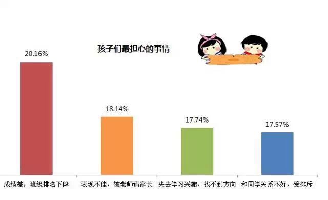 孩子们最担心的事情依次为:成绩差,班级排名下降(20.16%);表现不佳,被老师请家长(18.14%);对学习失去兴趣,找不到努力方向(17.74%);和同学关系不好,受排斥(17.57%)。