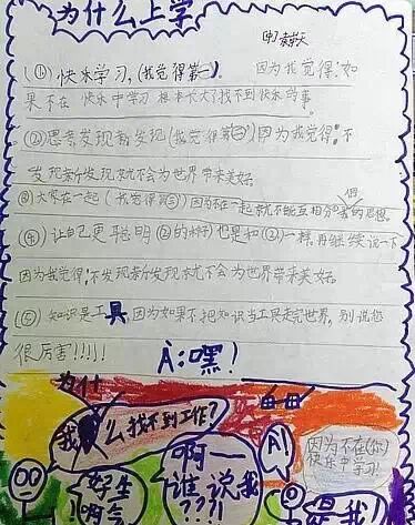 看到这个题目,拍拍脑袋就能想出孩子的回答:学习知识、实现理想……孩子的回答一定是真诚的。即便孩子说“报效祖国”、“找一份好工作”、“娶一个好媳妇”这样的话,孩子也是真诚的。